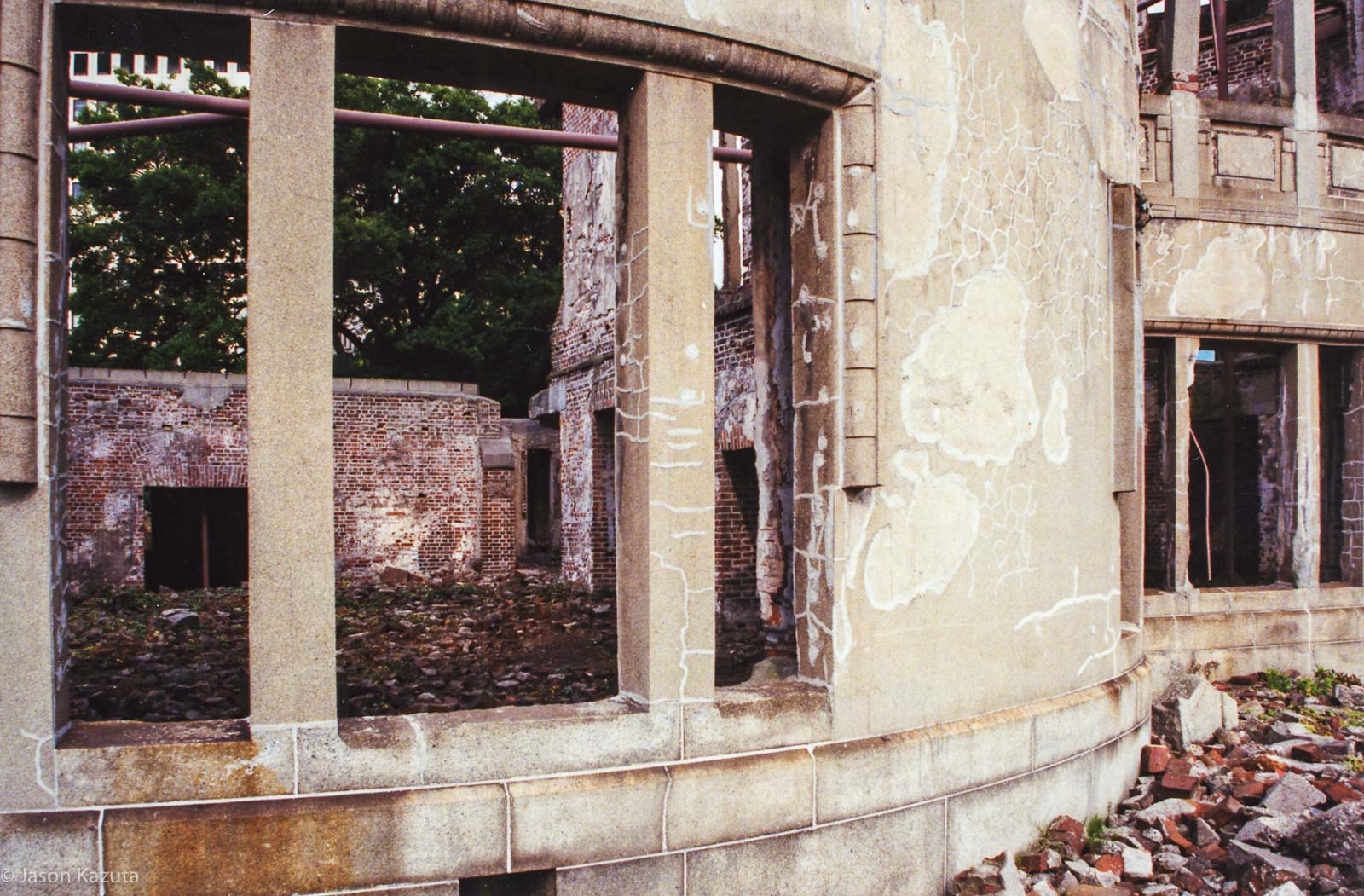 The former Hiroshima Prefectural Industrial Promotion Hall is now the world famous UNESCO Heritage Site, the Genbaku Dome. Because the explosion was almost directly overhead, the building kept its shape. Its vertical columns resisted the blast’s nearly vertical downward force, and parts of the concrete and brick outer walls remained intact. The building’s durability can also be attributed to its earthquake-resistant design; it has survived earthquakes before and since the bombing. Wikipedia