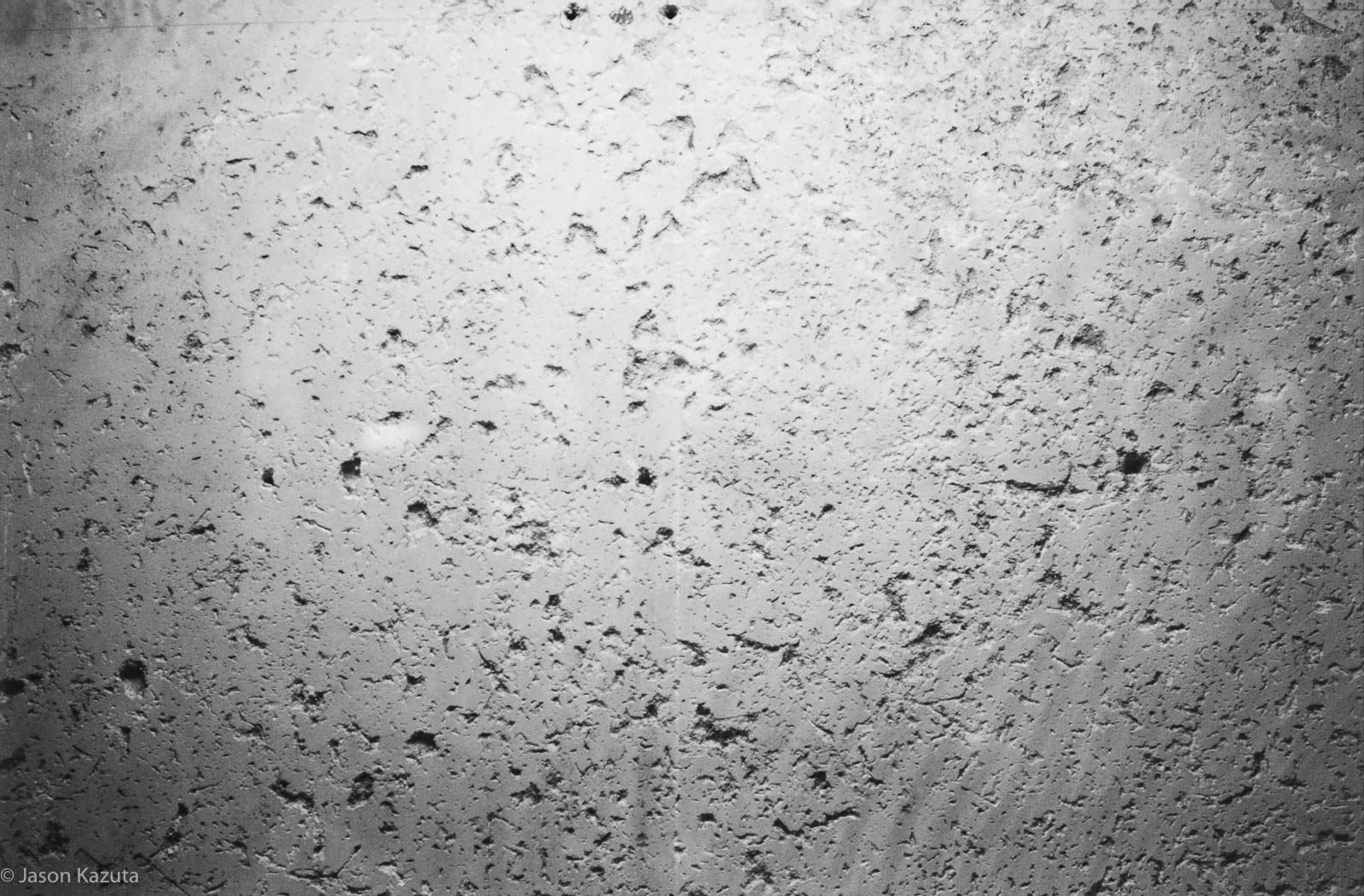 A concrete wall pockmarked by shattered glass propelled by the force of the bomb blast.