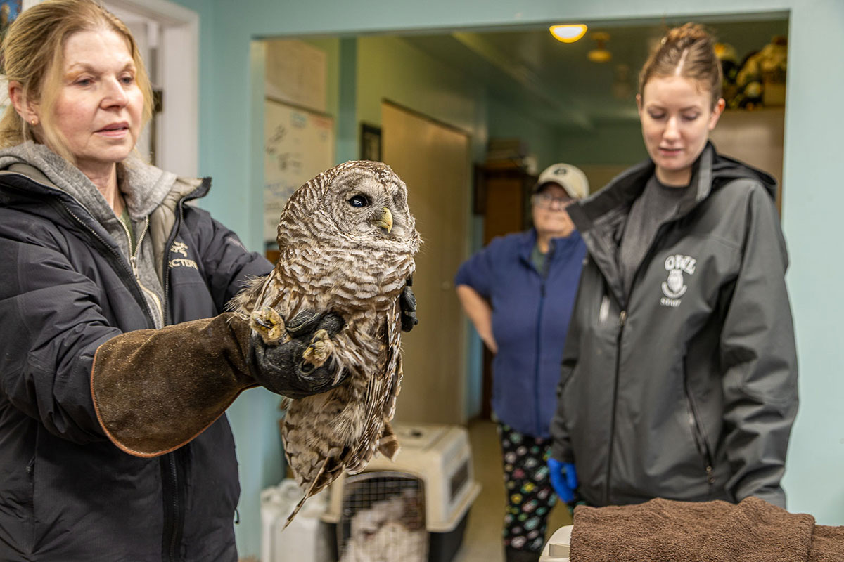 Rehabber Kris performs some preliminary exams on an absolutely thrilled looking Hooper before putting him in a pet carrier.