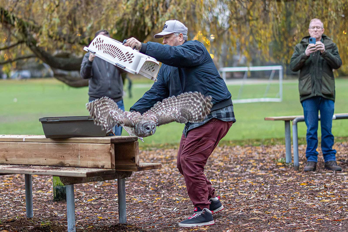 On November 23, a small entourage consisting of myself and some of the other regulars went to pick up Hooper at O.W.L., where he was gently put in a cat carrier and we released him in the same park where he hatched!  It was heartwarming to see him fly out of the carrier and into a nearby tree. I wondered if he recognized his old nest tree – did he remember the surrounding area where he and his sister grew up?  Would he recognize his family if he saw them again? Unfortunately, the rest of the family had since moved to another park about 2km away, but we hoped there might be a reunion of sorts. The best case scenario would be the rest of the family accepting him back, but the worst case scenario being Hooper would be killed by his own parents, mistaking him for an intruder on their territory.  However, Hoopers sister is still hanging out with their parents so I am hopeful.  Hooper was seen and heard in the neighbourhood for a day or two, but has not been seen since.  We hope he has set off to successfully establish a territory of his own, find a mate and is doing well. We cannot thank O.W.L. enough for doing the work they did to care for Hooper for 4 months!
