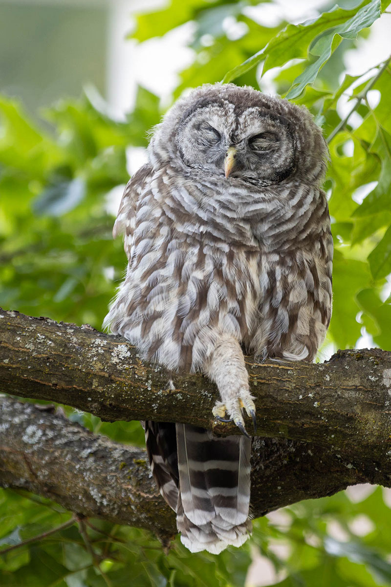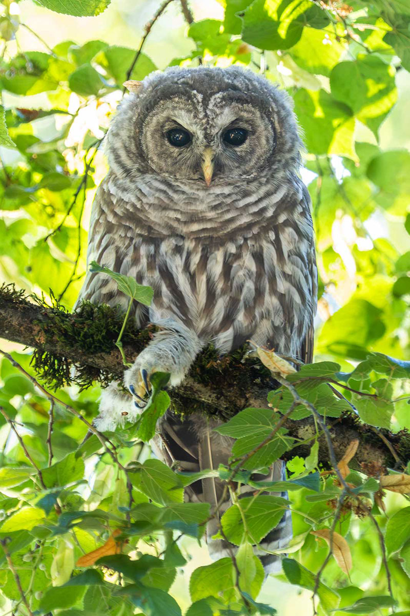 In my last post, I regaled you (or at least tried) with my story of a family of Barred Owls nesting in a tree close to Beau Photo. They were a real hoot, especially for the local residents and kids hoo had never seen an owl in the wild.  After the owlets fledged, they grew increasingly stronger and were able to fly farther from their nesting site.  By the middle of July, the owlets were becoming more difficult to find, usually seen up to 3 blocks from where they fledged, but always a treat to see them.  While able to fly short distances, they were far from able to hunt for themselves.  Ma or pa would still feed them every few hours, and this was the best time to find them, as the owlets would start screeching for food when hungry.