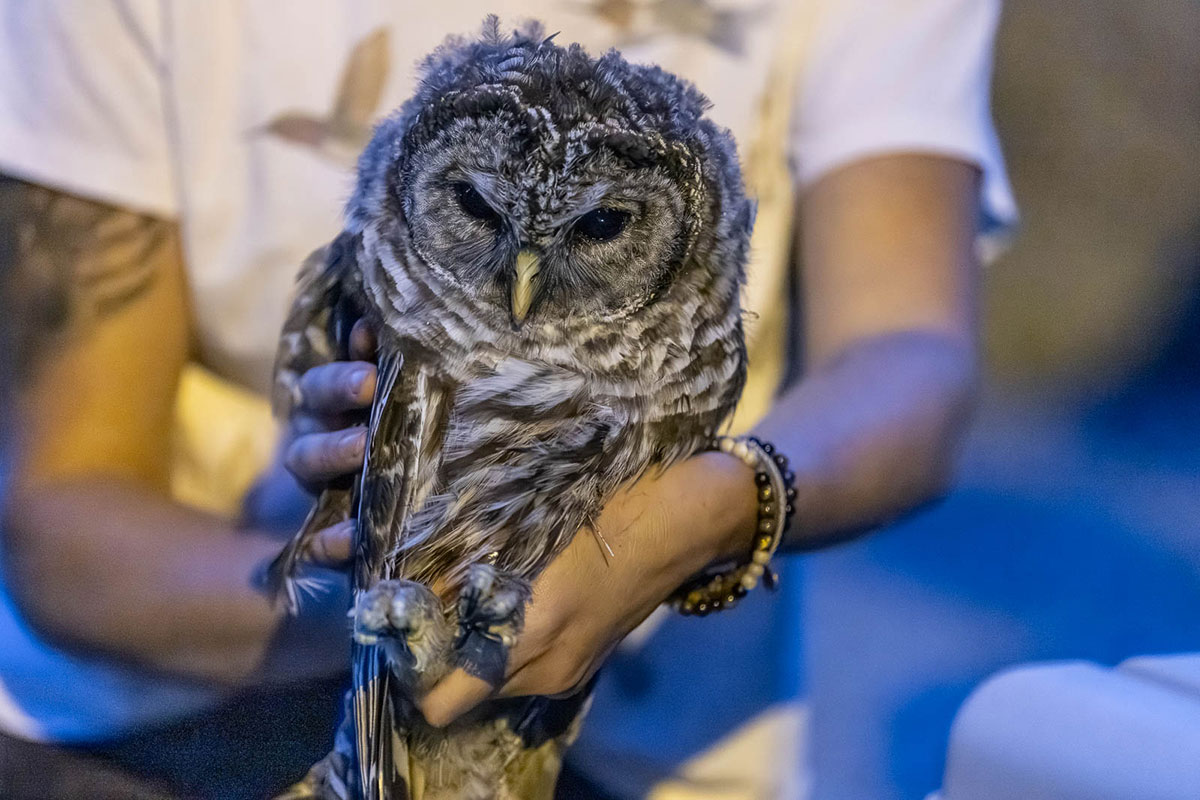 In the video above, you can see professional raptor rehabber Kris and her partner capture Hooper by temporarily blinding him with the flashlight and swooping in with the net. After a quick check to check the injury to his leg/foot (and to make sure she didn’t accidentally bonk him on the head), Hooper was put into a pet carrier.