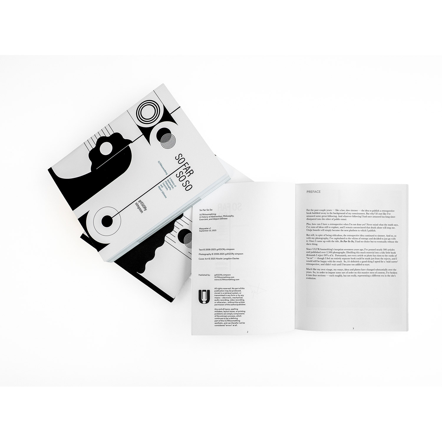 For seventeen years, without regard for monetization or popular acceptance, Vancouver-based photographer grEGORy simpson has published the ULTRAsomething.com website, penning nearly 300 thoughtfully conceived, yet decisively tongue-in-cheek essays, and publishing over 2500 photos. So Far So So mercilessly distills all this content down into a handy 398 page, 7in x 9in tome of ink and paper, meant for easy perusal by both newcomers and long-time readers, wishing to reminisce and ponder where all the years have gone.